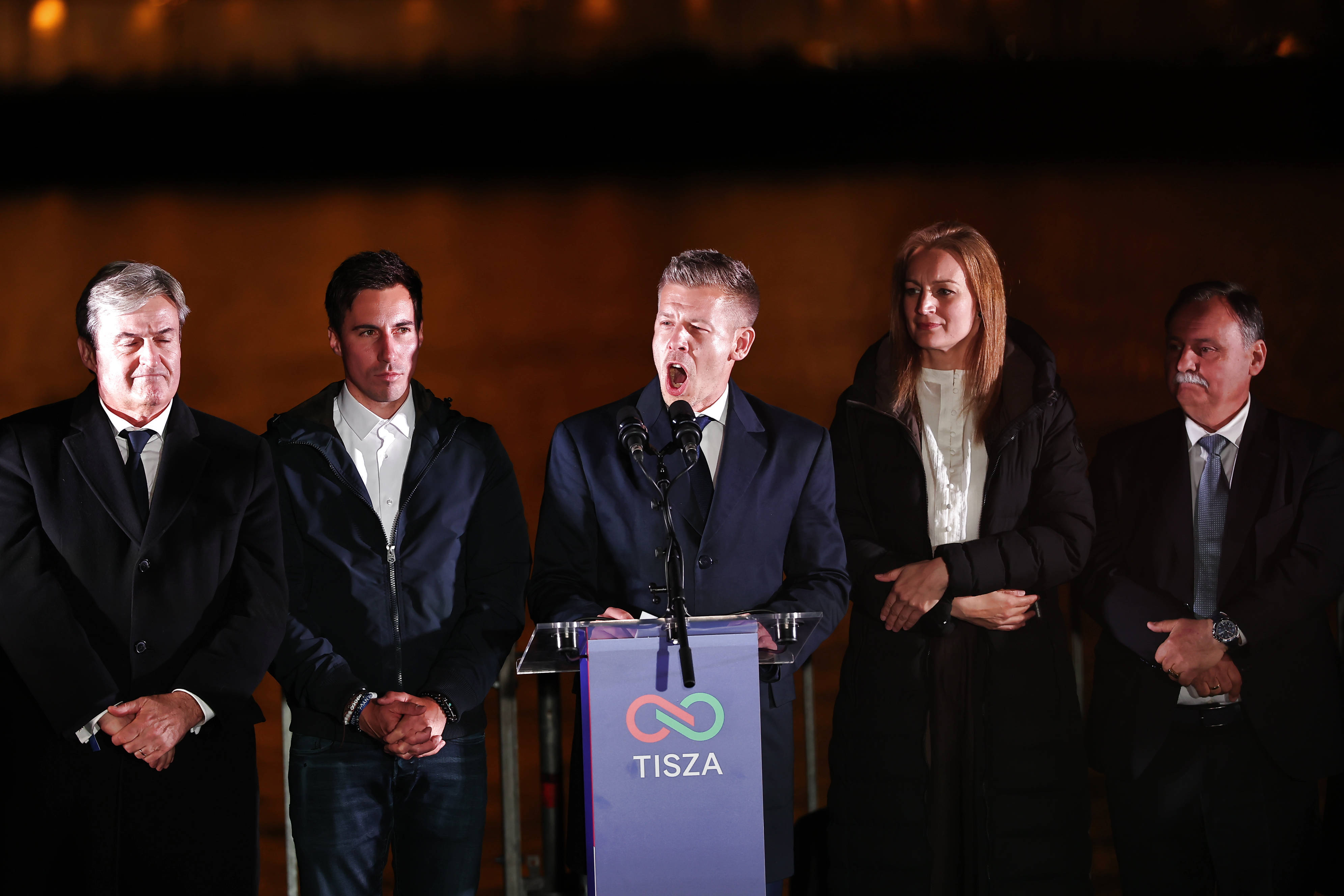 4月12日,在匈牙利首都布达佩斯,匈牙利蒂萨党领导人毛焦尔·彼得(中)在胜选晚会上讲话。新华社发(鲍洛格·达维德摄)法国总统马克龙12日向欧尔班的竞选对手、匈牙利反对党蒂萨党主席毛焦尔·彼得表示祝贺。