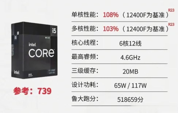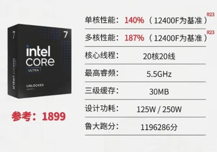 评价:价格反倒是下降了不少,这样看的话265KF性价比还不错。8大核12小核共20核20线程,睿频至高可达5.5GHz.多核性能强劲,能轻松应对多任务处理与大型软件运行,而且工艺提升功耗控制优秀,散热压力小。