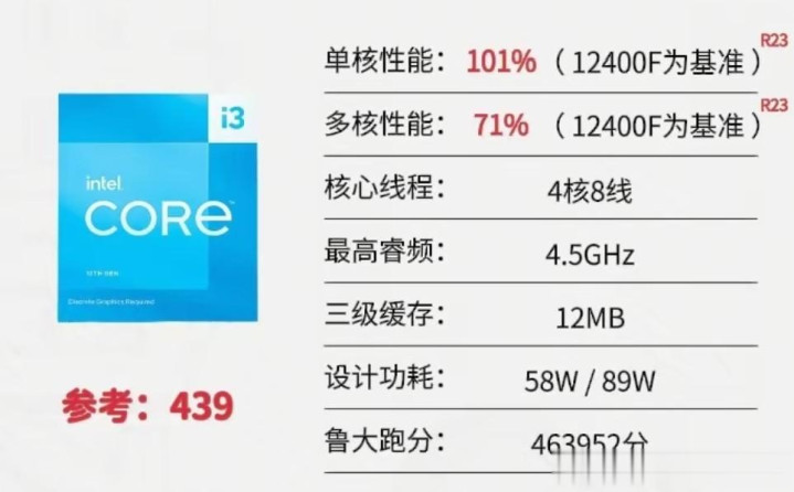 评价:i3-13100F和12100F两个差距不大,价格也上下十几块而已,随便买就完事了,都是四核八线,最高睿频比13100F弱了0.2GHz, 工艺制程不变,前段时间非常热门但是价格比九月涨价40%。